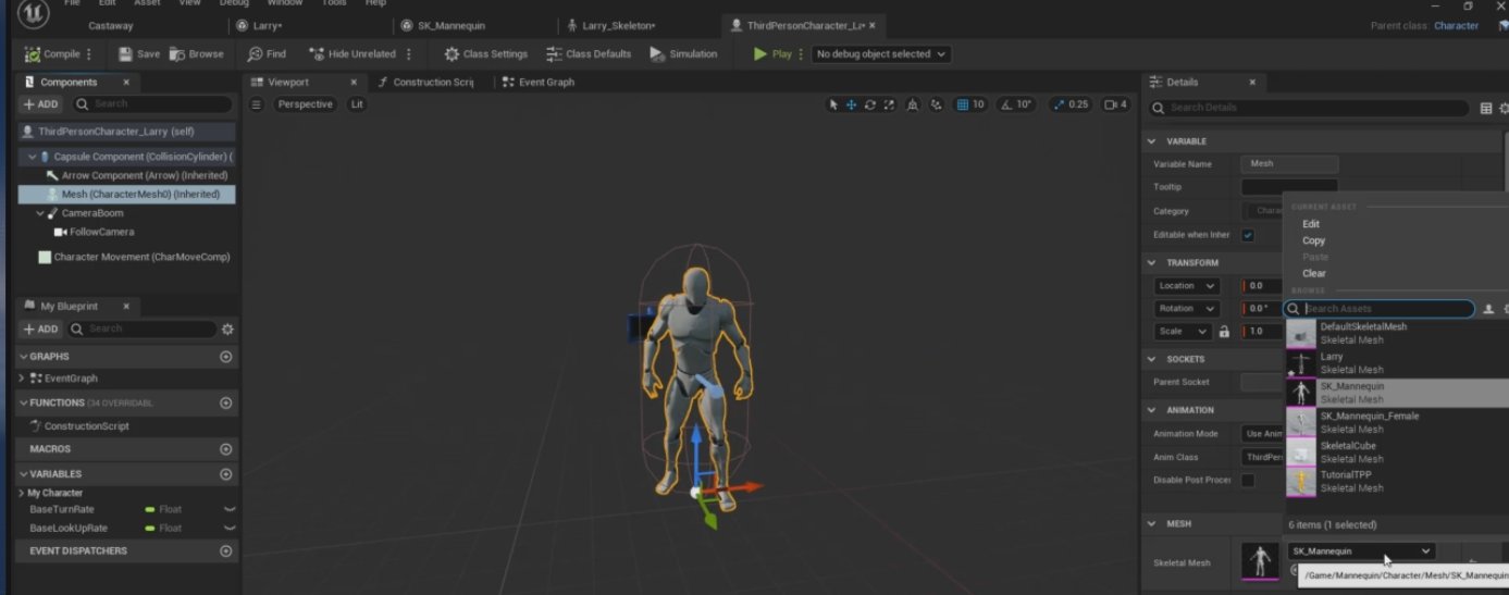 - 编辑新的角色蓝图(可以从旧的复制一个),更换MESH,更换动画蓝图,设置好位置
