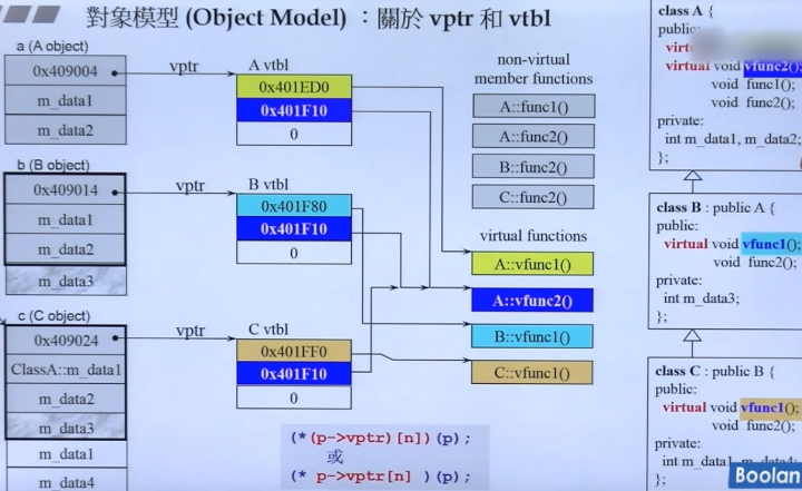 调用函数则是动态绑定,通过指针p找到vptr,找到vtbl,再找到调用的函数。(*p->vptr[n])§,则调用第n个虚函数。